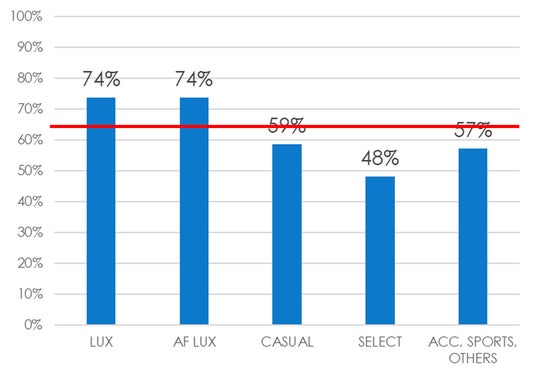 調査対象となったブランドのカテゴリーを見ていくと、ラグジュアリーブランド(LUX)とアフォーダブルラグジュアリーブランド(AF LUX)が全国平均スコアをけん引する傾向は昨年同様です。一方、今回の調査では、全国調査を開始して以来、全カテゴリーにおいて圧倒的なリードを続けてきたラグジュアリーブランドが大きく前年よりもスコアを落とし、アフォーダブルラグジュアリーブランドと並んで同率1位になるという大きな変化が見られました(図1)。また、同じラグジュアリーブランドであってもインデックスとなっているブランドごとにスコア差があったことや、ブランドの売上の好調不調と一定の相関性を示す結果となっていることは、大変興味深い点です。高い付加価値をもつ商材を取り扱うブランドであるからこそ、接客力もブランディングの構成要素として大きな比重を占めていることを感じさせる結果となりました。