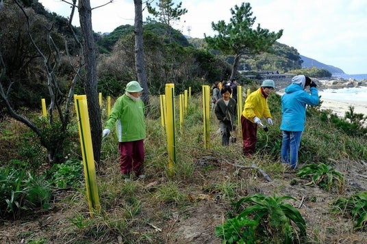 屋久島の北西部に位置する永田いなか浜は、日本一のウミガメの産卵地。さらには、北太平洋最大のアカウミガメの産卵地として知られています。近年の台風や松くい虫の影響により、永田いなか浜周辺の松林は大きな被害を受けました。松林には防風や砂の流出防止、塩害防備といった重要な役割があり、またウミガメにとっては浜への光の流入を防ぐ遮光林としても大切な存在です。