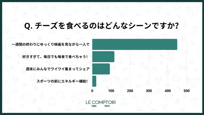 さらに、チーズを食べるシーンでダントツに多いのがひとり時間にリラックスしながらのんびり食べる、というシチュエーション。自分が心から美味しいと思えるお気に入りの一品を探したい、というニーズが大きいことも窺えます。