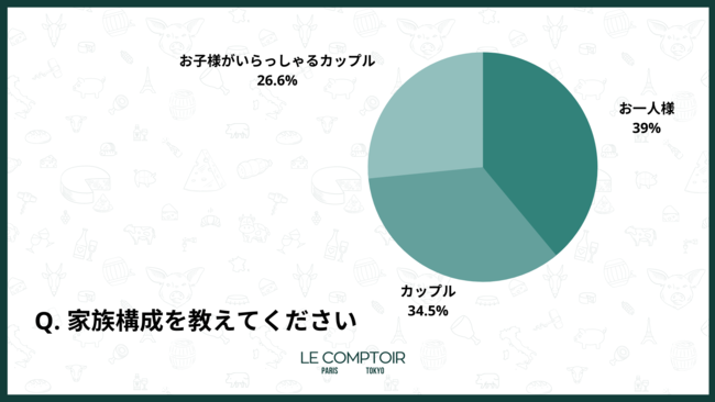 家族構成では「お一人様」が1番多く、次いで、「カップル」、「お子様がいらっしゃるカップル」の回答に。単独でも、誰かとシェアしながらでも、チーズを楽しんでいただけていることが分かりました。