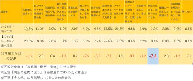 「このためなら仕事を頑張ることができる」という、今の若手社員の働く意欲の源泉について、最も近いと思うものから順に1~3位まで選択してもらいました。社会人1~3年目を想定した18~25歳の1位は「プライベートを充実させる」。管理職の第1位は「人間的な成長」でした。