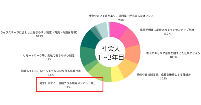 ・社会人1~3年目(18~25歳)の1位:発言しやすく、信頼できる職場メンバーと風土