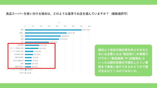 商品の価格、品質、品揃えといった商品周りへの注力も大切だが、さらにお客さまからの指名を獲得するために、「販促施策」や「店舗演出」といった効果を可視化しにくい活動についても、着実かつ、幅広く実行していくことで、お客さまの「来店理由」や「買う理由」を増やすことにもつながっていくのではないか。