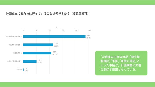 「計画的に買い物をする」際に行っていることとして、「冷蔵庫の中身を確認」が79.7%。次いで「特売情報の確認」で38.5%に着目