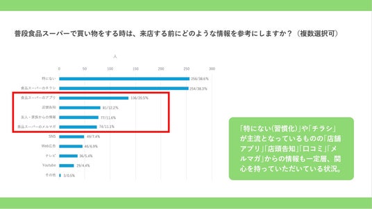 「食品スーパーのアプリ」「店頭告知」「友人・家族からの情報」「食品スーパーのメルマガ」に着目