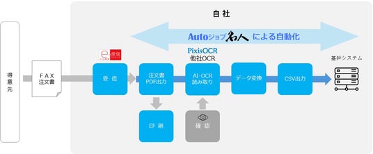 「FNX e-受信FAXサービス」は、PCからの簡単操作で、受信したFAXの仕分け・閲覧・検索・編集・返信を可能とするサービスです。また、「Robo派遣」は「FNX e-受信FAXサービス」で受信したFAX注文書のダウンロードやAI-OCRによる読み取り(Pixis OCR等)、データ変換、出力まで、一連の処理を自動化します。