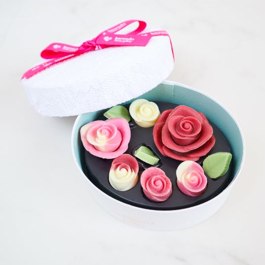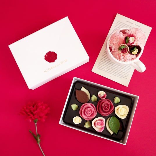 赤・ピンク・ホワイトの小さなバラのつぼみを花束のように仕立てた、母の日限定の特別なチョコレート。箱を開けた瞬間、その華やかさに思わず「こんなチョコレート見たことない!」と驚きと感動が広がります。