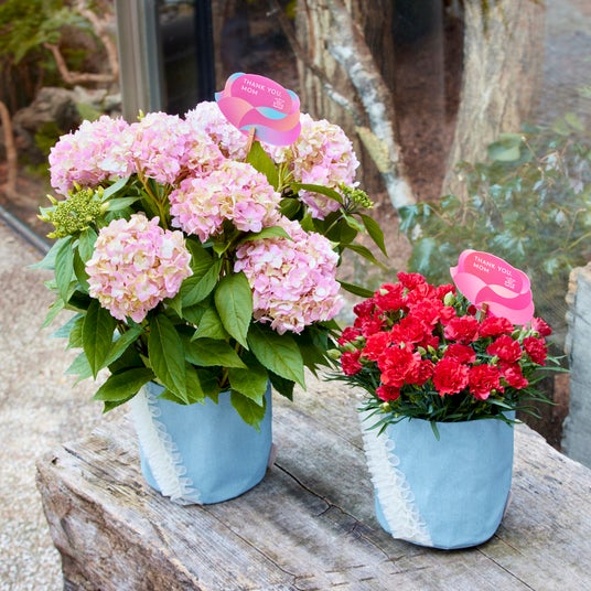 写真左:アジサイ鉢 5寸、写真右:カーネーション鉢 5寸