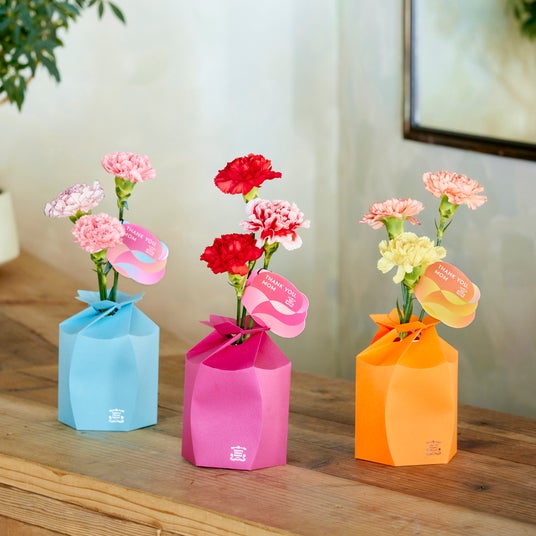 オンラインショップには、ここでしか手に入らない限定商品が充実。カーネーションを主役にした、上品で華やかなボックスギフトは、 鮮やかな真紅のカーネーションが目を引き、パッケージにあしらわれた曲線が洗練された雰囲気を演出してくれます。保水ゼリーが入ったカップに花をいけているので、そのまま飾ることができ、インテリアに彩りを添えてくれます。