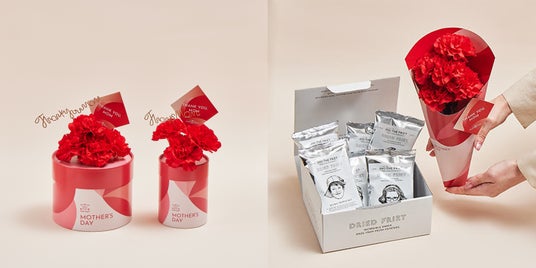 フラワーギフトとお菓子のセットもラインナップ豊富にご用意。最高のフレンチフライを追究するフレンチフライ専門店「AND THE FRIET(アンド ザ フリット)」のドライフリットが楽しめるギフトボックスと、上品で華やかなクレープ型のブーケをセットでお届けする数量限定ギフトが登場。 こだわりの素材を使用し、ゆっくり時間をかけてサクサク食感を引き出したプレミアムスナックとブーケのセットは、グルメなお母さんへのプレゼントにおすすめです。