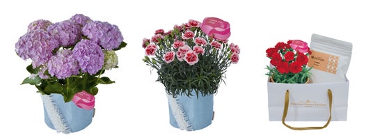 今年はサイズや種類がより充実し、定番のカーネーションやアジサイ以外に、ベゴニアや胡蝶蘭、カフェ・ティーハウス オリジナルのバラの紅茶とミニサイズのカーネ―ションがセットになったギフトも。