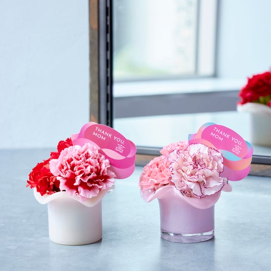 オリジナルのミニフラワーべ―スと、カーネーションがセットになったアイテム。フラワーベースは、太陽の光を空があたたかく包み込むような、やわらかいツートーンカラー。デスクや小さなスペースを華やかに彩ってくれます。