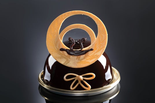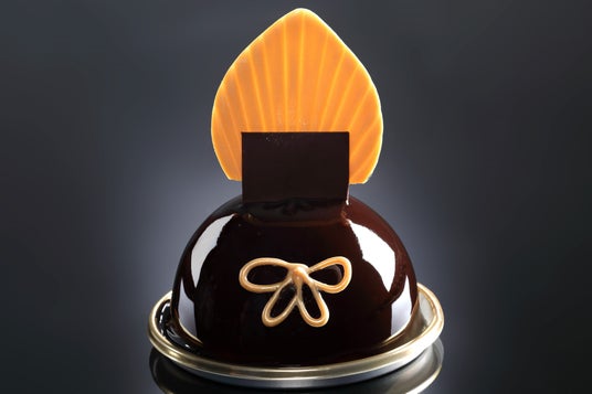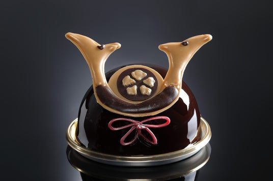 豊臣秀吉マンゴー、パッションフルーツ、チョコレートで仕上げたエキゾチックでさわやかな甘さのムースケーキ。豊臣秀吉の兜「一の谷馬蘭後立付兜」を表現しました。
