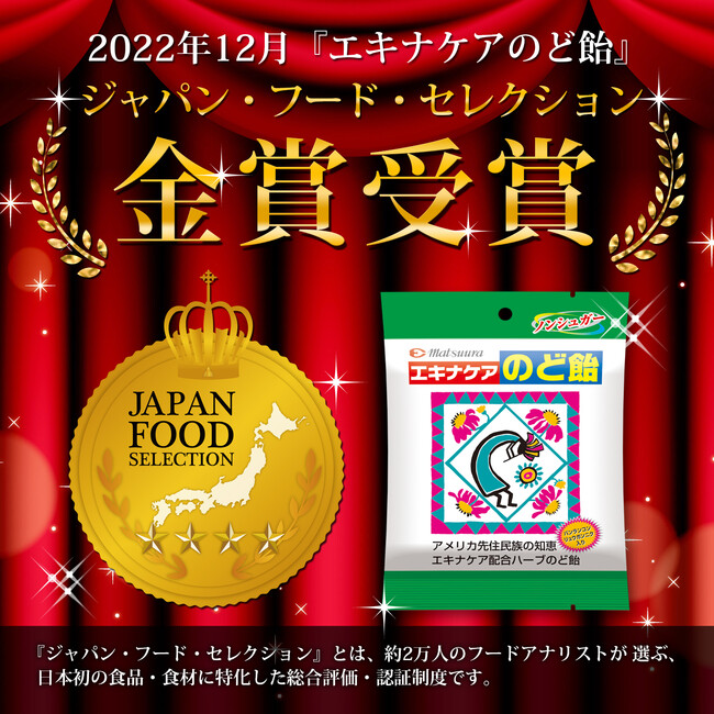 漢方薬および健康食品の企画・製造ならびに販売を手掛ける松浦薬業株式会社(本社営業所:愛知県名古屋市昭和区、代表取締役社長:渡辺知幸)の『エキナケアのど飴』は、一般社団法人日本フードアナリスト協会が主催する「第58回ジャパン・フード・セレクション(2022年12月)」において「金賞」を受賞いたしました。