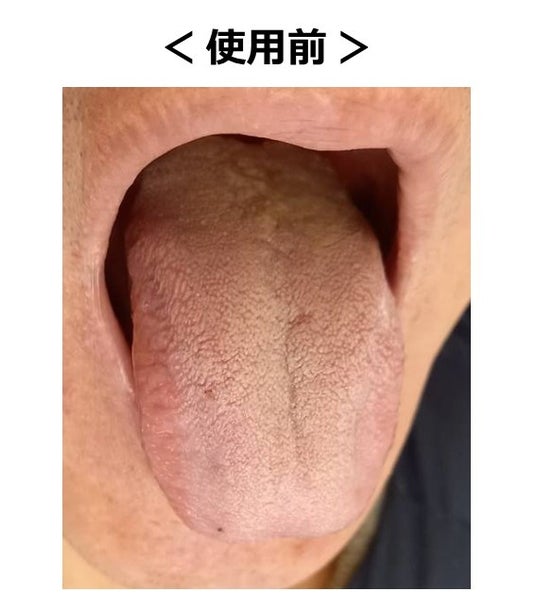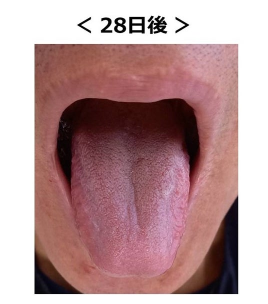 DOMAC配合のノンシュガーキャンディを使用する前(左)と、28日間摂取した後(右)の舌苔の付着状態の写真。キャンディ摂取によって舌苔の付着状態が改善されている。
