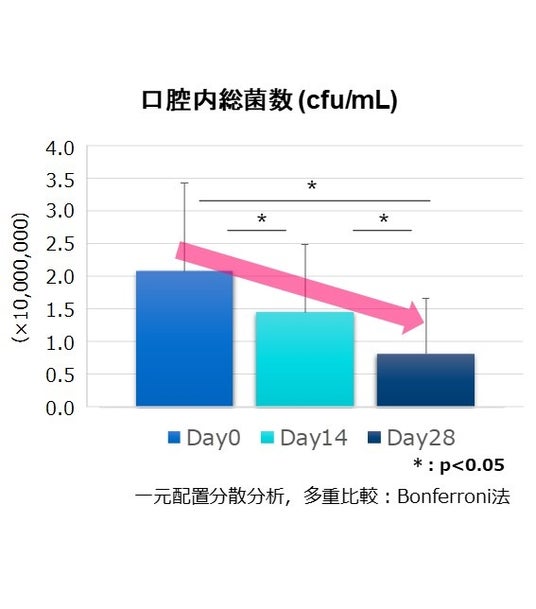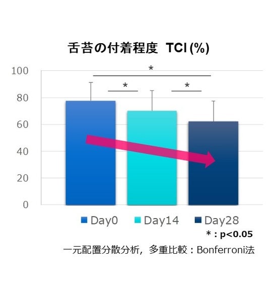 ・調査方法 : 朝食後、夕食後、どちらかの時間帯にDOMAC配合ノンシュガーキャンディを1日1粒28日間食べて頂き、試験開始時(摂取前)、14日後、試験終了時にそれぞれ、歯科医師の視診による舌苔の付着程度(TCI)の評価と口腔内細菌数を細菌カウンタ(PHC社)にて測定した。