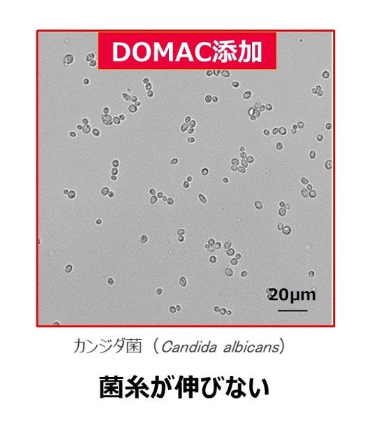 2015年に帝京大学とUHA味覚糖との共同事業として開発された独自成分がDOMACです。研究の当初から、カンジダ菌の菌糸形発育抑制を抗菌活性の指標として評価を続け、立証されてきました。DOMACはライチ由来ポリフェノールやサケ白子由来ペプチドなど食品に含まれる成分とシナモンなどのアロマ成分から構成されています。