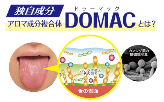 舌苔にも存在する「カンジダ菌」に着目して開発されたのが「DOMAC」。ライチ由来のポリフェノールやシナモン、サケ白子由来のペプチドなど、食品に含まれる成分を配合したアロマ成分複合体です。