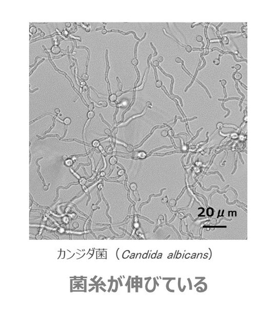 カンジタ菌は、口腔内に常在する酵母の仲間(真菌)ですが、加齢などによる体内環境の変化に伴って菌糸を伸ばす菌糸形発育のスイッチが入ります。この菌糸の発育が進み舌の表面に網目状に絡みつくことで、汚れが溜まりやすくなり、舌苔を形成します。さらに、菌糸が舌組織に侵入して、口腔カンジダ症を引き起こす場合もあります。