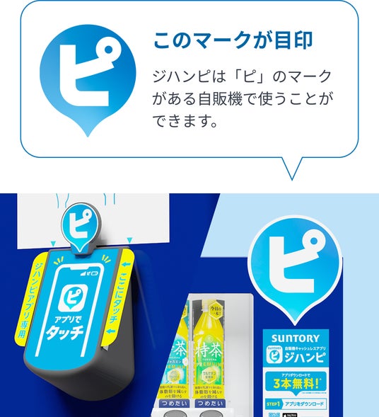 「ジハンピ」は、アプリを起動して、ピッとタッチするだけで買える自販機キャッシュレスアプリです。誰でも、簡単に、すぐ買えるシンプルな体験が実現されています。右上に「ピ」のロゴマークがついている自販機でご利用可能です。