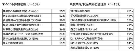 来場した学生へのアンケ―ト(n=132)では、イベント参加理由で最も多かった回答が「農業界への就職を希望しているから」(55%)、次いで「新たな企業を知る機会になりそうだから」(52%)、「初期品業界への就職を希望しているから」(50%)という結果になりました。
