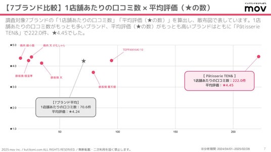 こちらの散布図では、調査対象7ブランドの「1店舗あたりの口コミ数」「平均評価(★の数)」を算出しています。1店舗あたりの口コミ数がもっとも多いブランド、平均評価(★の数)がもっとも高いブランドはともに「Patisserie TEN&」で222.0件、★4.45でした。