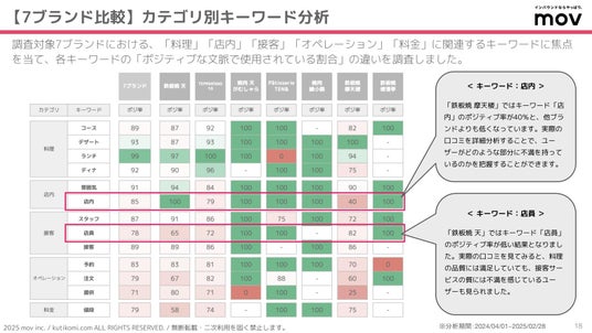 こちらの表では、調査対象7ブランドの「料理」「店内」「接客」「オペレーション」「料金」に関連するキーワードに焦点を当て、各キーワードの「ポジティブな文脈で使用されている割合」の違いを調査しています。