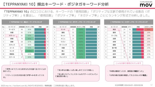 こちらの表では、「TEPPANYAKI 10」の口コミにおける、キーワードの「使用回数」「ポジティブな文脈で使用されている割合(ポジティブ率)」を算出し、「使用回数」「ポジティブ率」「ネガティブ率」ごとにランキング形式で分析しています。