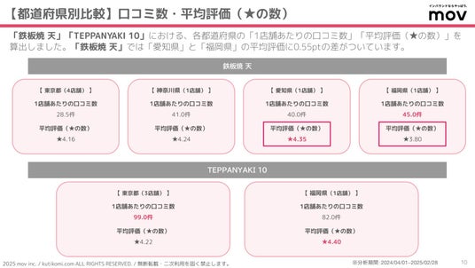 こちらのスライドでは、「鉄板焼 天」「TEPPANYAKI 10」における、各都道府県の「1店舗あたりの口コミ数」「平均評価(★の数)」を算出しています。「鉄板焼 天」では「愛知県」と「福岡県」の平均評価に0.55ptの差がついています。