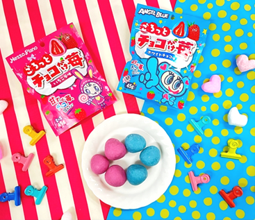 2000年代初頭に大ブームとなったファッションブランド「エンジェルブルー」「メゾピアノ」とコラボしました!当時、小・中学生だった女性になつかしさ・エモさを与えてくれる商品です。パッケージは、キャラクターを全面に出し、「ナカムラくん」と「ベリエちゃん」が目立つようにデザインしております。また、所々包材がキラキラ光るように施しており、ブランドイメージに合わせて派手に可愛く仕上げました!キャラクターカラーに合わせ、エンジェルブルーは青のチョコレート、メゾピアノにはピンクのチョコレートをフリーズドライの苺にコーティングしています。