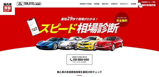 輸入車買取センターは、「アルピナ」「BMW」や「ベンツ」「ポルシェ」など様々な輸入車を対象として高価買取を行っています。最短29秒のスピード相場診断で買取相場を確認可能!輸入車専門だから叶う高価買取をぜひお試しください!!