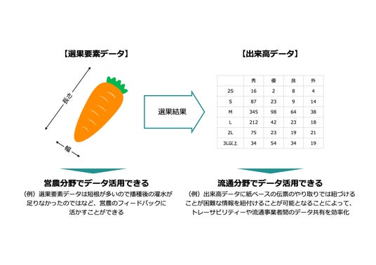 選果機データは選果結果による秀・優・良やサイズといった「出来高」データとセンサーを通じて農産物の形状など様々な要素の数値を取得する「選果要素」データがあります。それぞれ出来高データは流通分野での活用、選果要素データは営農分野での活用ができると考えられます。