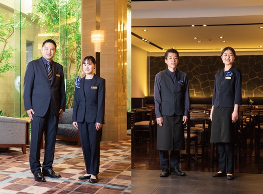 左:フロントスタッフおよび料飲サービススタッフ(一部)新ユニフォーム、右:料飲サービススタッフ新ユニフォーム