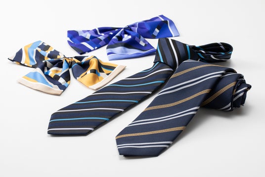 左上:女性用スカーフ兼男女兼用チーフ、右下:男性用ネクタイ