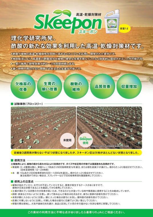 アクプランタ株式会社は、理化学研究所の研究成果を社会実装するために設立された理研ベンチャー企業で、JAアクセラレータープログラム※1の第1期採択・優秀賞受賞企業でもあります。その研究成果は世界的に評価の高い学術誌Nature Plantsにも掲載されており、その世界に先駆けた研究成果を基に開発された革新的な資材が「Skeepon(スキーポン)」です。酢酸をベースにつくられた資材で、植物体に吸収させることで、高温・乾燥環境下で植物の耐性を向上させます。