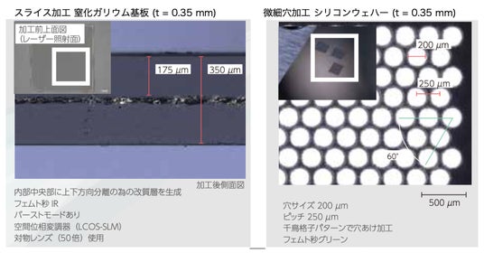 10^-15 (10のマイナス15乗)という極めて短い時間のパルス幅でレーザーを照射する事で、対象素材に熱影響を与える事無く、精密微細加工が可能になる技術です。当社では半導体ウェハー表面のガラス剥離加工やSiC、GaN、ダイヤモンド等のパワー半導体材料向け材料への難加工を請け負い、次世代半導体の普及促進に寄与しています。