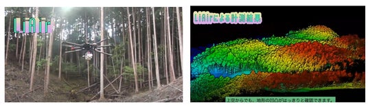 LiDAR活用事例の一つとして、レーザードローンとLiDARを組み合わせ、森林全体のマッピングと樹木1本1本の高さを測定し、森林の育成・維持管理に寄与しています。