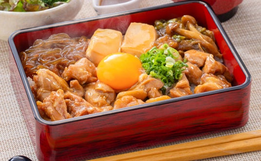甘からいタレが染み込んだ鶏肉に、白菜、豆腐、しめじ、白滝を加えてじっくり煮込んだ鶏すき焼き重。とろりとした生玉子が絡み、甘みと旨みが調和する濃厚な味わいをさらに引き立てます。