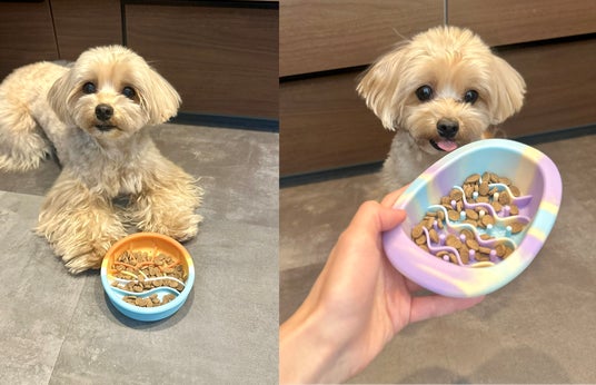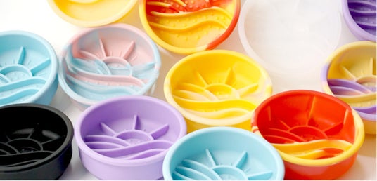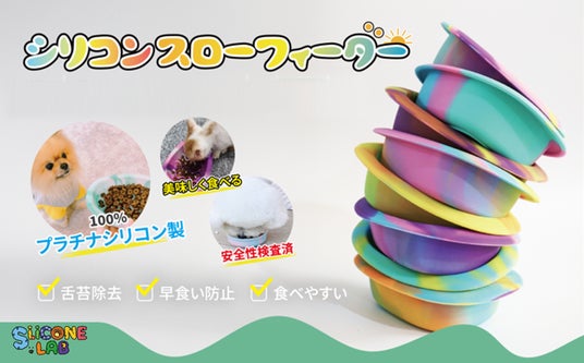 「SILIKING(シリキング)」スローフィーダーは、幼児用品や介護、医療用品としても普及が広まるプラチナシリコンを100%原料とした安全性の高さと豊富なカラーバリエーションが魅力です。内側に並ぶ様々な形状の突起は、適度に食事の難易度を上げることで多くのペットが抱える「早食い」「飲み込み食べ」を抑止し、さらには何度も舐め食べることで舌表面の苔除去ができ口臭軽減につながります。