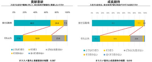自ら選んだ企業が、「推せる職場」だととらえている新入社員は、「それ以外」だととらえている人に比べて積極的に職場に貢献したい割合が51.3ポイント高くなり、その組織で臨む成長が期待できるととらえている割合がそれ以外に比べて65.3ポイント高い結果となりました。