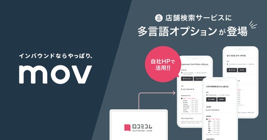 この度のオプション機能追加により、口コミコムを利用して自社ホームページの店舗検索ページを複数言語で構築・一元管理ができるようになるほか、訪日外国人の特性に応じて店舗情報の発信ができるようになります。これまで数多くのインバウンド支援をしてきたmovが、自社ホームページを通じた店舗のインバウンド対策や訪日外国人向けの販促強化をより一層ご支援してまいります。