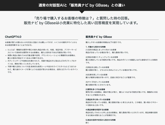 「販売員ナビ by GBase」は、販売員が日々直面する現場の課題に対応するため、接客・クレーム対応・売上管理など34分野にわたる業務ナレッジを搭載。AIに質問すれば、実務に直結する回答が得られます。
