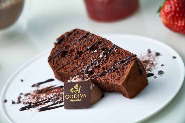 GODIVAのエグゼクティブシェフ・パティシエ、ヤニック・シュボローによるオリジナルレシピのシフォンケーキです。しっとりとした生地にチョコレートをかけ、チョコレートクリームを添えました。コーヒー、紅茶どちらにもぴったりのケーキです。GODIVAらしいチョコレート尽くしのメニューです。(銀座店のみ取扱がございません|数量限定・イートインのみ)