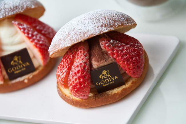 GODIVAのミルクチョコレートとダークチョコレートをたっぷり使ったクリームに、春らしくフレッシュな苺を添えました。甘味のあるクリームに生の苺の酸味がよく合います。季節限定のGODIVAカフェのマリトッツォです。※5月末までの限定です。