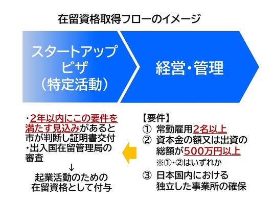 【参考】外国人起業活動促進事業(スタートアップビザ)について外国人が「経営・管理」の在留資格の認定を受けるには、地方出入局在留管理局への申請時に、事業所の開設、職員雇用及び資本金の額等の要件を満たすことが必要です。