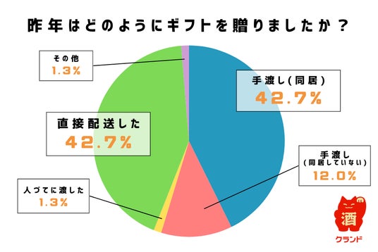 手渡し(同居している) 42.7%、手渡し(同居していない) 12.0%、人づてに渡してもらった 1.3%、直接配送した 42.7%、その他 1.3%