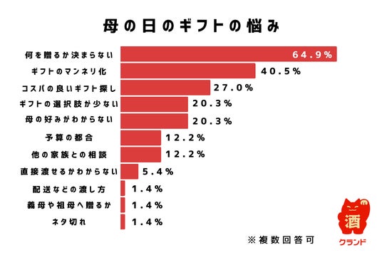 何を贈るか決められない 64.9%、ギフトの選択肢が少ない 20.3%、ギフトのマンネリ化 40.5%、母の好みが分からない 20.3%、予算の都合で悩んでいる 12.2%、コスパの良いギフトを探している 27.0%、直接渡せるか分からない 5.4%、配送や受け取り方法で悩んでいる 1.4%、他の家族と相談中 12.2%、母以外(義母・祖母など)にも贈るか迷っている 1.4%、ネタ切れ 1.4%