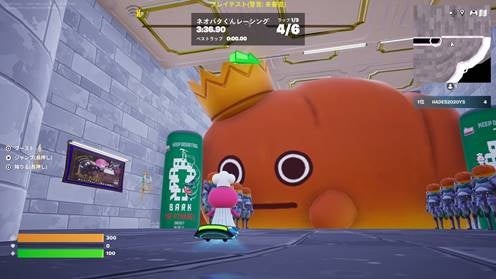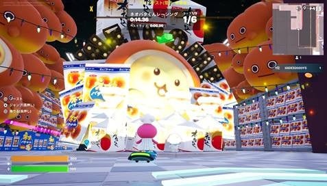 フォートナイトの世界と融合し、すべてが巨大化してしまったベルク店内で、一定時間速度を加速させるブーストを駆使して、ライバルの誰よりも速くゴールを目指します。実際の店内掲示物などで再現されたベルク店内をイメージしたレースコースにはフジパンの隠しキャラクターの存在などやりこみ要素もあり、この機会にベルク×フジパンの世界観をゲーム内でお楽しみください。
