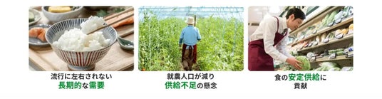 食に直結する農業は、常に需要のある分野です。世界的な人口増加により食料ニーズは高まっていますが、日本国内では就農人口が減少し、耕作放棄地が増えてきているのが現状。農地の管理を怠り荒廃が進むと、再利用をするのが難しくなってしまい、国内での食料供給不足が懸念されます。