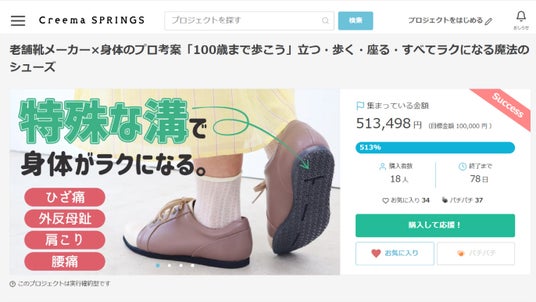 “老舗靴メーカー×身体のプロ考案「100歳まで歩こう」立つ・歩く・座る・すべてラクになる魔法のシューズ“のクラウドファンディングにて、プロジェクト開始から約3時間で目標を達成することができました。